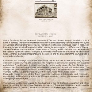 The heritage building now houses the headquarters of the RD Sethna Scholarship Fund which owns the building. Architect Vikas Dilawari’s restoration of Esplanade House won an Honourable Mention at the 2014 UNESCO Asia-Pacific Awards for Cultural Heritage Conservation.