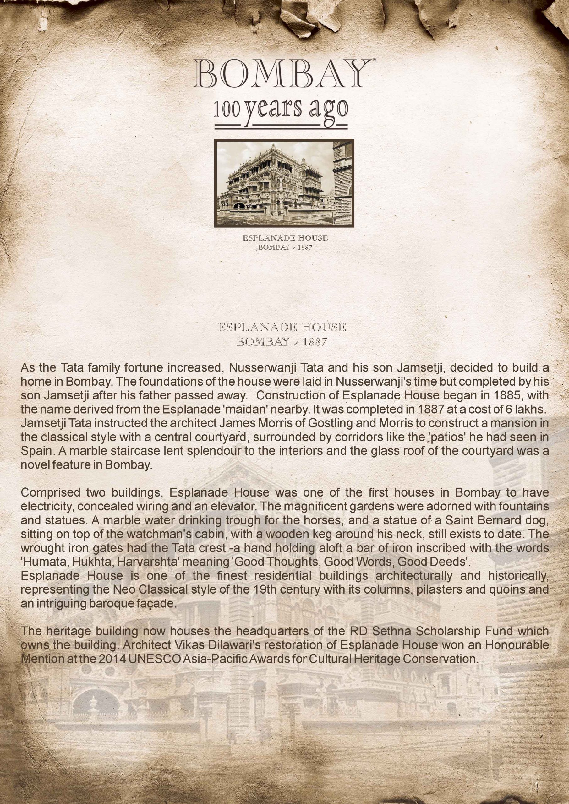 Esplanade House derives its name from the Esplanade ‘maidan’ nearby. It is one of the finest residential buildings architecturally and historically, representing the Neo Classical style of the 19th century with its columns, pilasters and quoins and an intriguing baroque façade. Esplanade House was once the private residence of industrialist Jamsetji Tata. The construction of this grand building began in 1885, based on designs by Mr Morris (of Gostling and Morris and Jamsetji Tata himself. It was completed in 1887.