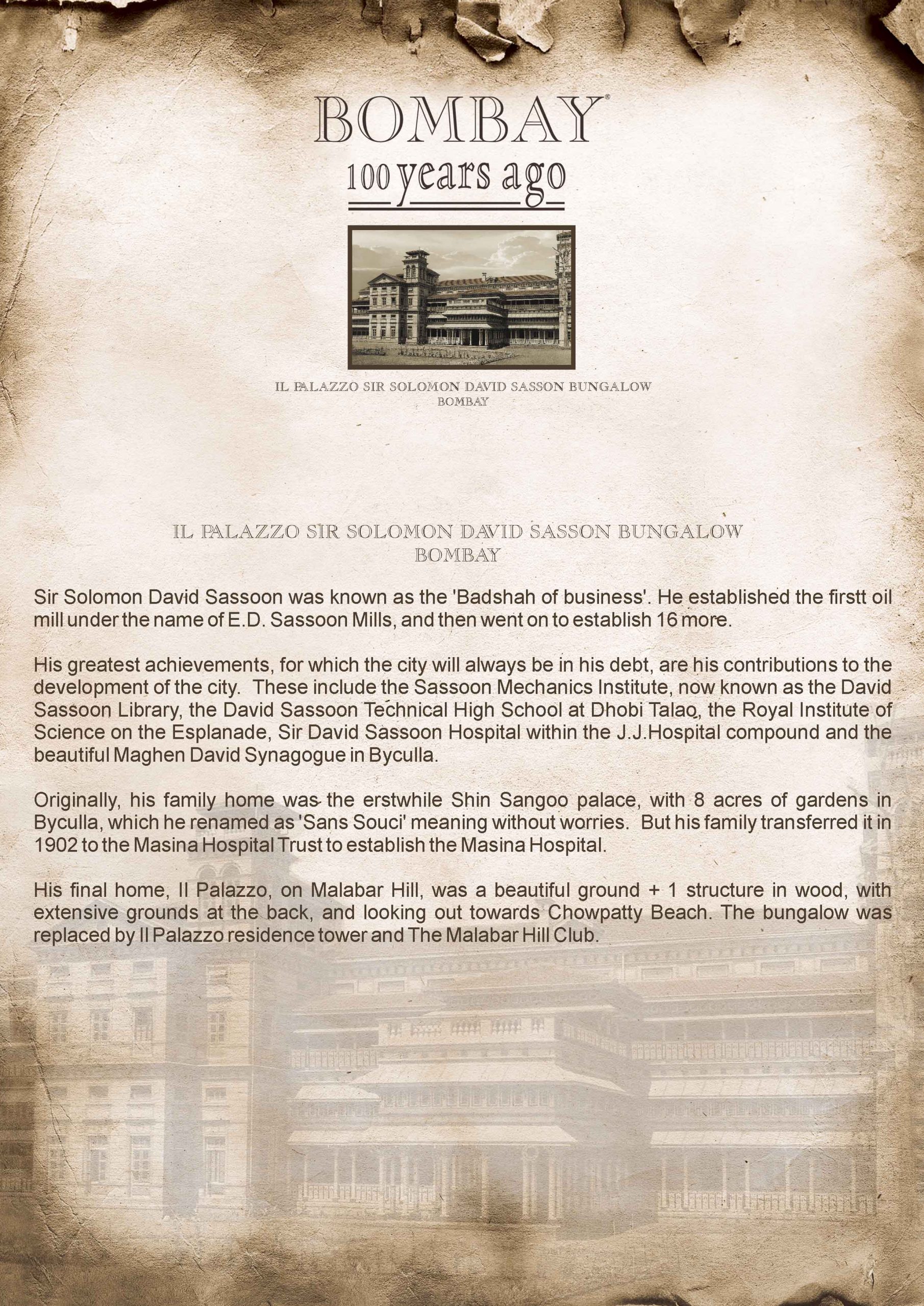 His greatest achievements, for which the city will always be in his debt, are his contributions to the development of the city.  These include the Sassoon Mechanics Institute, now known as the David Sassoon Library, the David Sassoon Technical High School at Dhobi Talao, Royal Institute of Science on the Esplanade, Sir David Sassoon Hospital within the J.J.Hospital compound and the beautiful Maghen David Synagogue in Byculla.